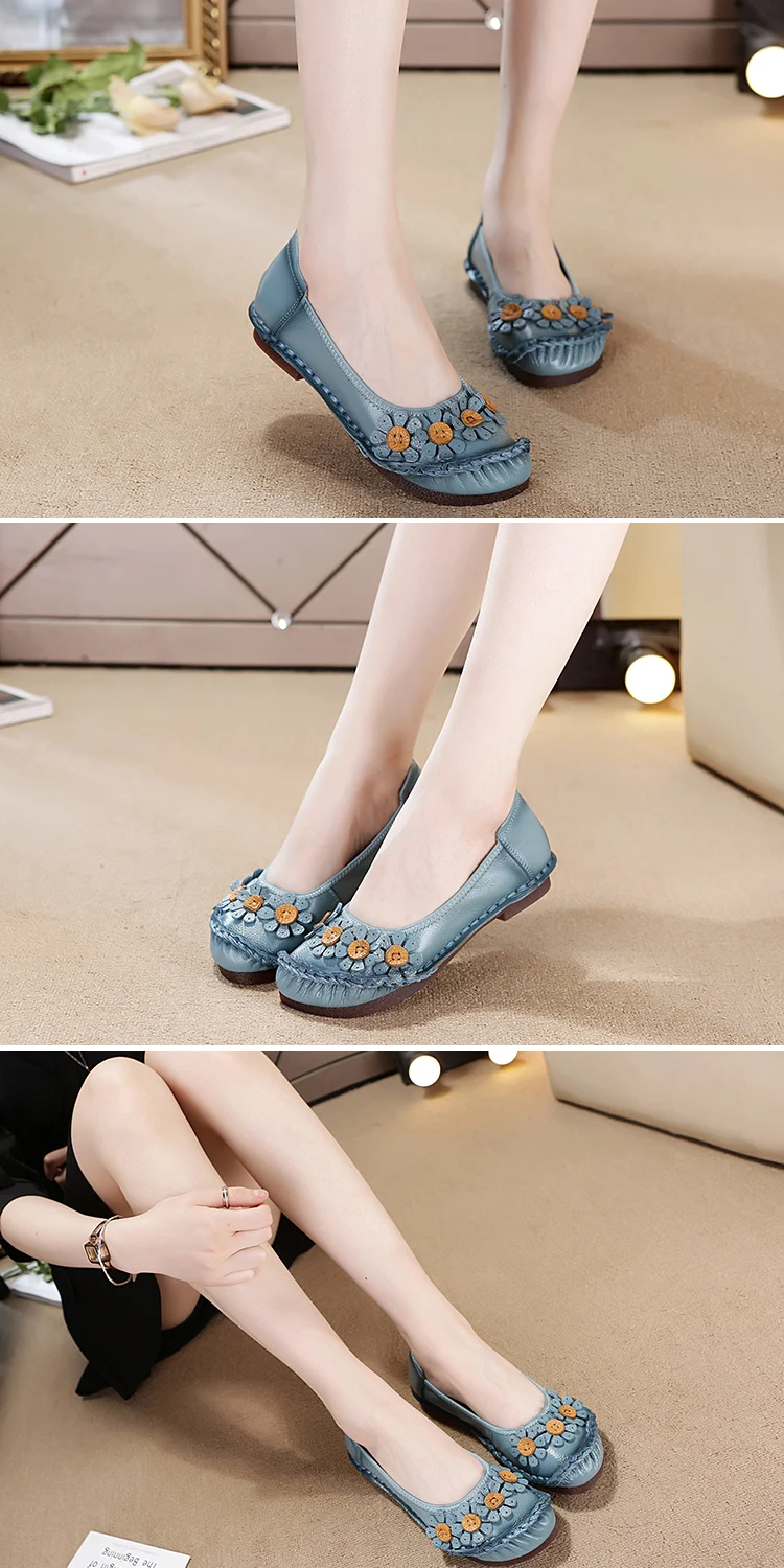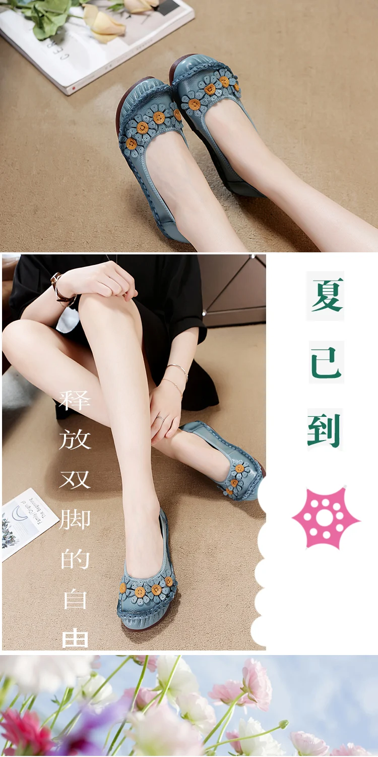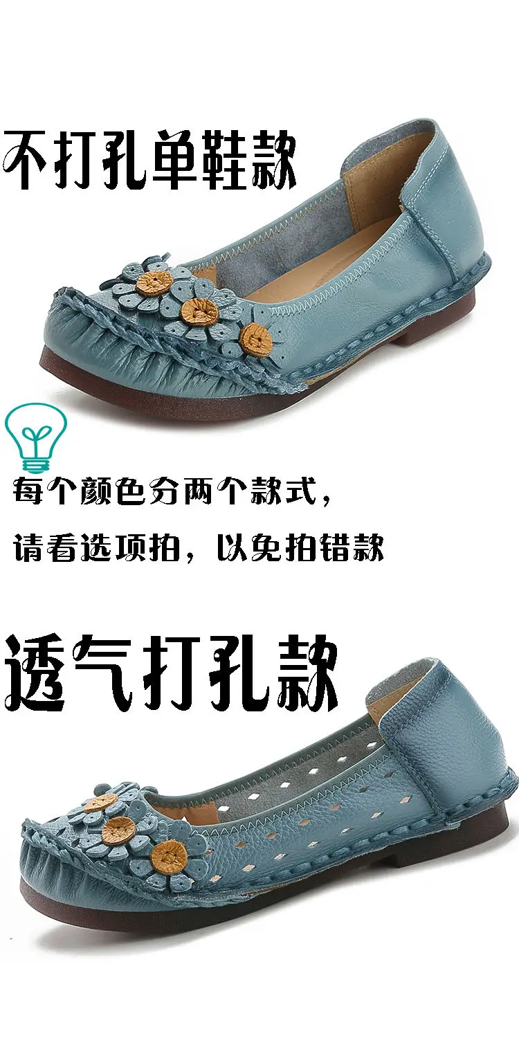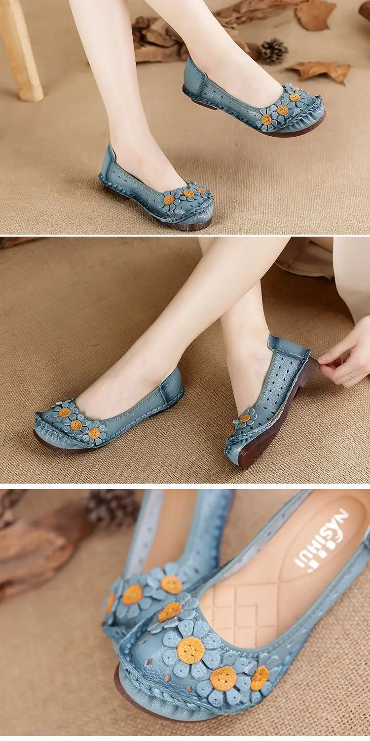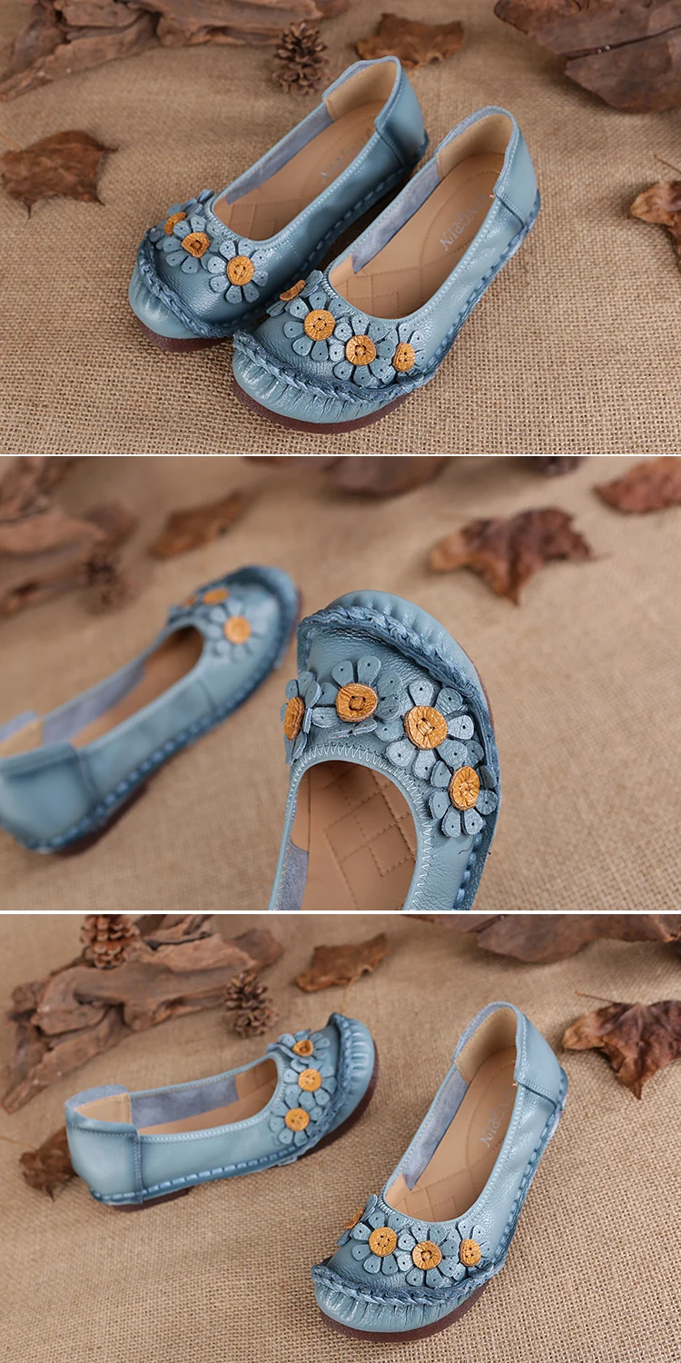 Blue Mom Casual Flats Woman Soft Floral Oxford Shoes for Women Summer Genuine Leather Shoes Ladies Handmade Sewing Flats