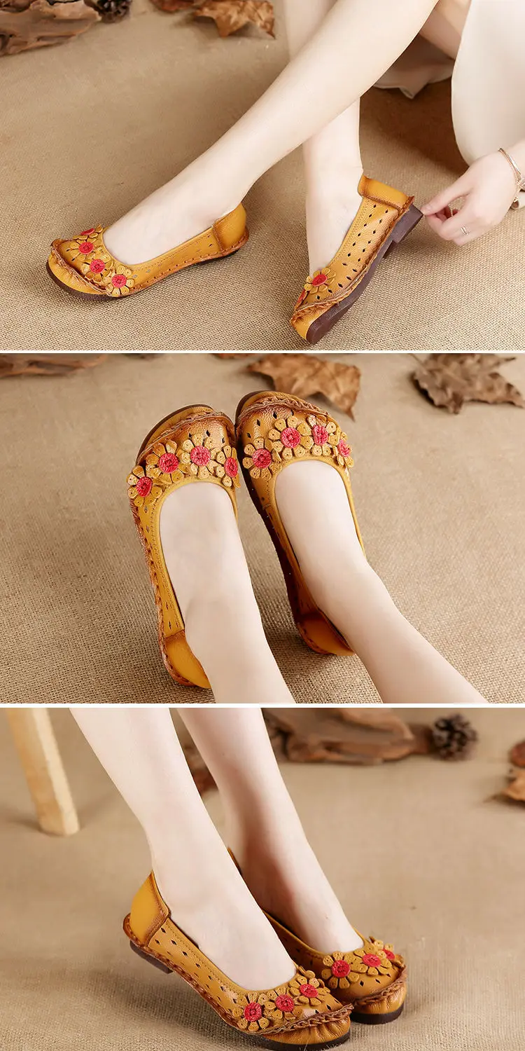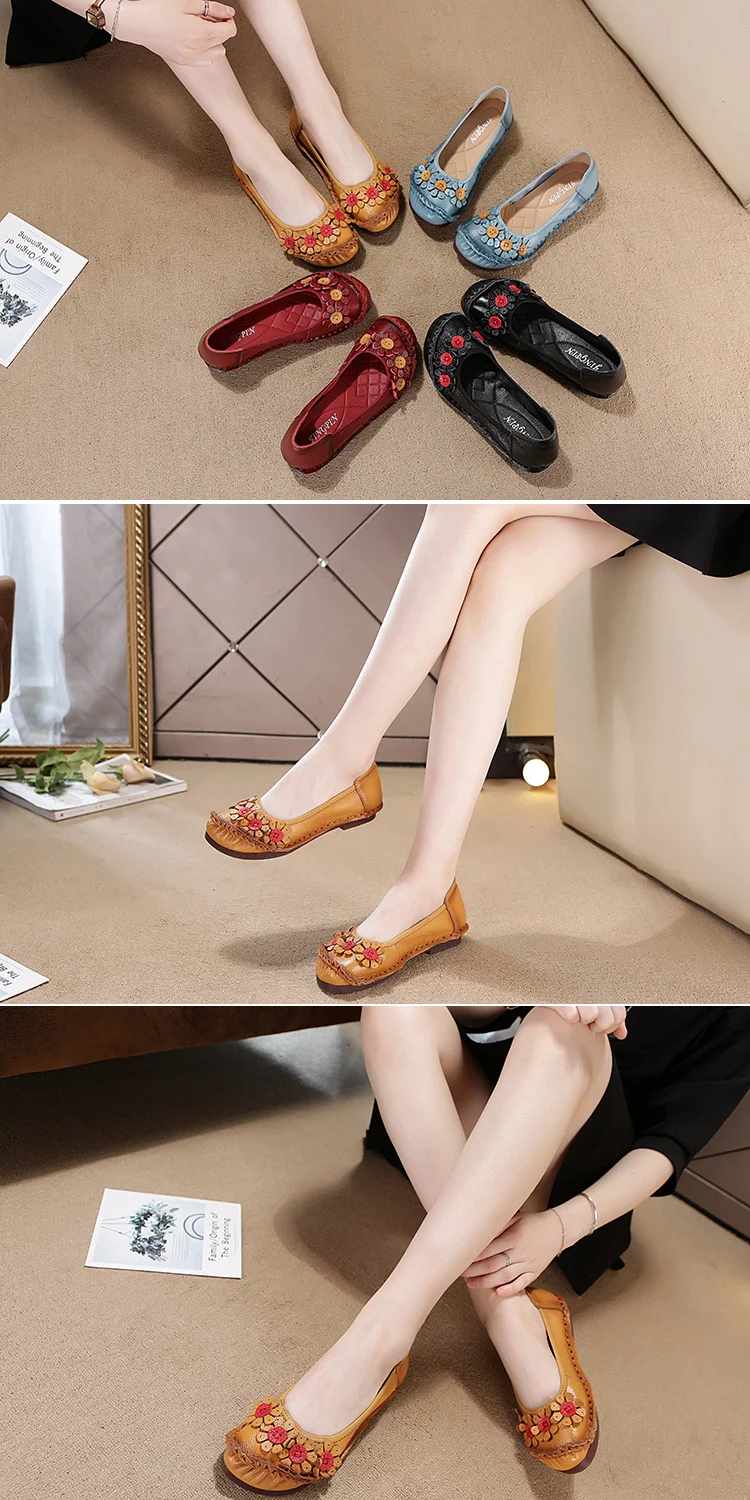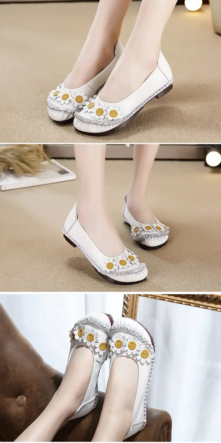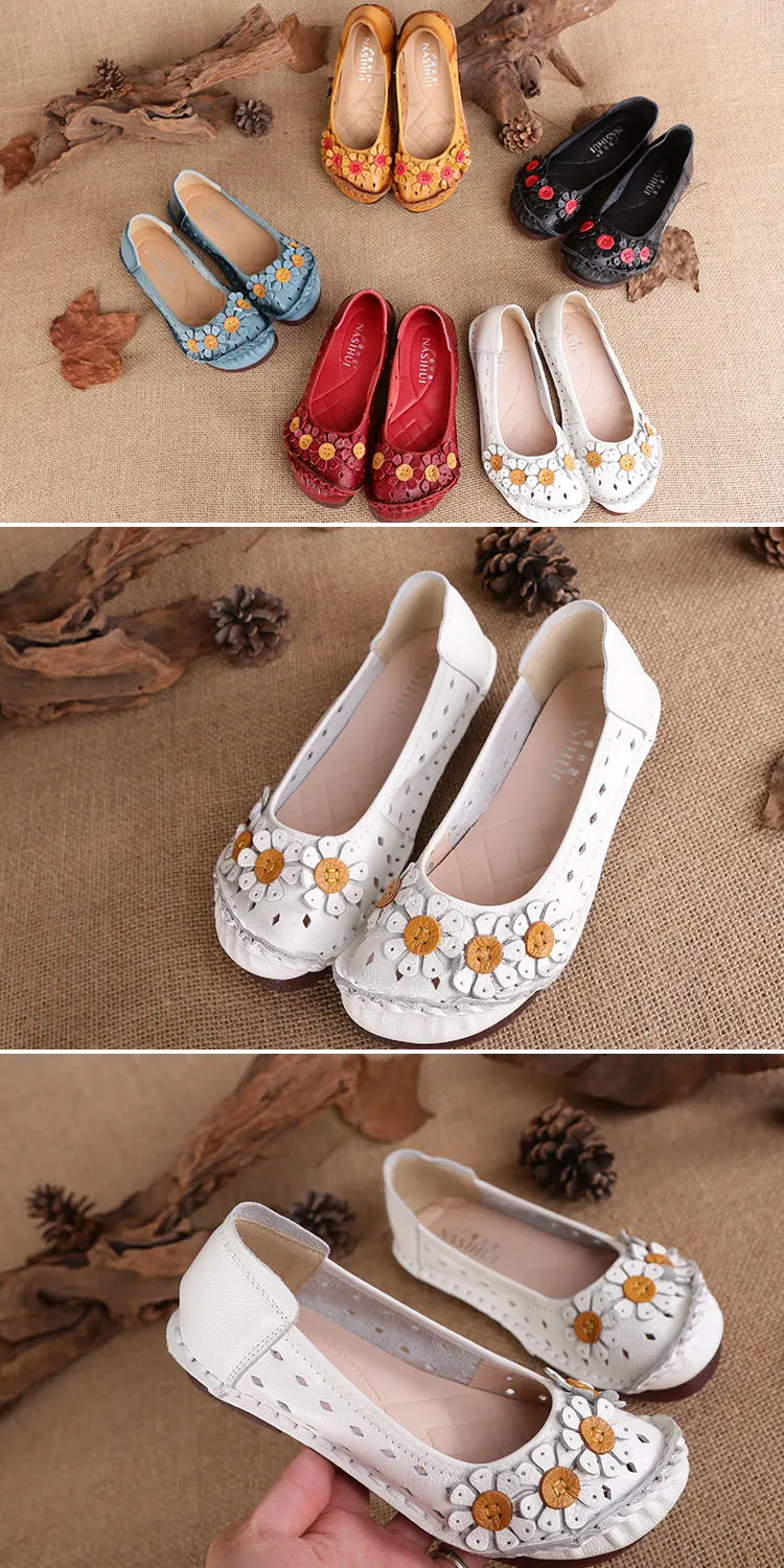 Blue Mom Casual Flats Woman Soft Floral Oxford Shoes for Women Summer Genuine Leather Shoes Ladies Handmade Sewing Flats